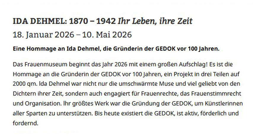 IDA DEHMEL – IHR LEBEN, IHR WERK | Frauenmuseum Bonn | 18.Jaunar bis 10. Mai 2026 |